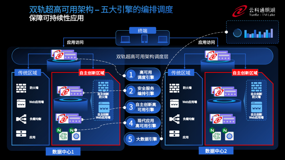 为实现双轨超高可用架构信创区和非信创区的跨域协同,实现信创区域和非信创区域的平滑过渡,神州3044永利通过五大引擎实现多层次的应用可持续性。